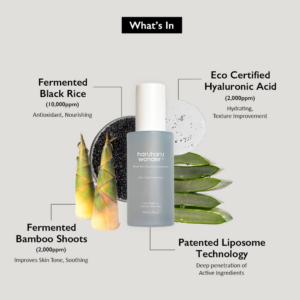 Water, Glycerin, Betaine, Propanediol, Oryza Sativa (Rice) Extract, Phyllostachys Pubescens Shoot Bark Extract, Aloe Vera Leaf Extract, Panax Ginseng Root Extract, Aspergillus Ferment, Hyaluronic Acid, Beta-glucan, Carbomer, Xanthan Gum, Trehalose, Tromethamine, 1,2-Hexanediol, Butylene Glycol, Sodium Phytate, Polyglyceryl-10 Laurate, Polyglyceryl-10 Myristate, Pulsatilla Koreana Extract, Usnea Barbata (Lichen) Extract, Zanthoxylum Piperitum Fruit Extract, Cyclodextrin, Alcohol, Lavandula Angustifolia (Lavender) Oil.