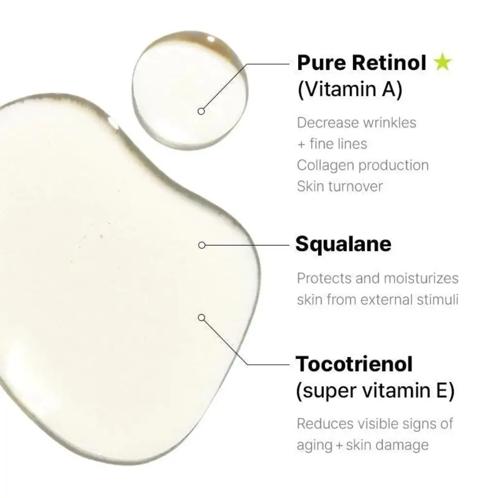Squalane, Glycine Soja (Soybean) Oil, Di-C12-13 Alkyl Malate, Retinol, Caprylic/Capric Triglyceride, BHT, Tocotrienols, Tocopherol, Elaeis Guineensis (Palm) Oil, Hydroxymethoxyphenyl Decanone.